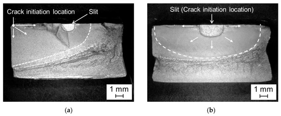 The fatigue limit of WNS1.0 was equivalent to that of WN as described above. Therefore, a semicircular slit that is less than a = 1.0 mm can be rendered harmless following NP treatment because this situation satisfies condition (a). In addition, a fatigue crack occurred at a different location compared to the slit for all WNS1.0 samples that fractured during the fatigue test, which is indicated by the asterisks (*) in Figure 5b. The fracture surfaces of WNS1.0 and WNS1.5 that were observed using a digital optical microscope are shown in Figure 7. The fracture surface of WNS1.0 is completely different from that of WNS1.5 that fractured from the slit (Figure 7b). Therefore, a semicircular slit of a = 1.0 mm was rendered harmless in terms of the crack initiation location.