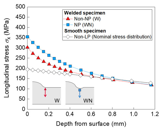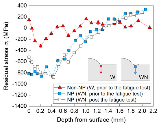 The residual stress distributions of W and WN are shown in Figure 8. The tensile residual stress was induced at the surface of the weld toe of W due to welding. However, this changed to a large compressive residual stress after NP treatment. The surface compressive residual stress prior to the fatigue test corresponded to approximately 820 MPa. The maximum compressive residual stress corresponded to 850 MPa and was measured at a depth of 0.4 mm. The distance from the surface to the zero residual stress point was approximately 1.3 mm. The residual stress of WN was redistributed due to cyclic loading and the compressive residual stress at the surface was reduced to 520 MPa. Moreover, it was slightly increased at a depth of 0.7–0.9 mm to maintain the equilibrium of the elastic stress field. The maximum compressive residual stress and the zero residual stress point were nearly the same before and after the fatigue test. Section 3.3 explains the reduction of surface compressive residual stress. However, the large and deep compressive residual stress remained high at positions of 1 mm and deeper even after the fatigue test, which greatly contributed to the improvement in the fatigue limit and extension of the acceptable slit size to a depth of 1.0 mm.