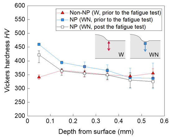 Figure 9 shows the in-depth hardness profiles. The hardness of W slightly changed (mean value of 360 HV), but this change was not significant. In contrast, the hardness near the surface of WN prior to the fatigue test corresponded to 510 HV, which was 1.5 times higher than that of W. The hardness of WN gradually decreased with increasing depth until it reached the same hardness of W at that depth, which was approximately 360 HV. Following the fatigue test, the hardness of WN at the surface reduced to 420 HV. At the points that are deeper than 0.15 mm from the surface, the hardness of WN decreased to nearly the same hardness it had prior to the fatigue test. The decrease in the hardness after the fatigue test indicates that the surface layer of WN became easy to yield after the fatigue test because of cyclic softening [19,20,21] caused by the specimen under a cyclic load. Therefore, the reduction in the surface compressive residual stress mentioned in Section 3.2 was caused by local yielding created by a large compressive residual stress.