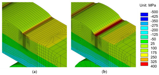 Contour of the longitudinal stress at a normal bending stress of 200 MPa for: (a) W and (b) WN.