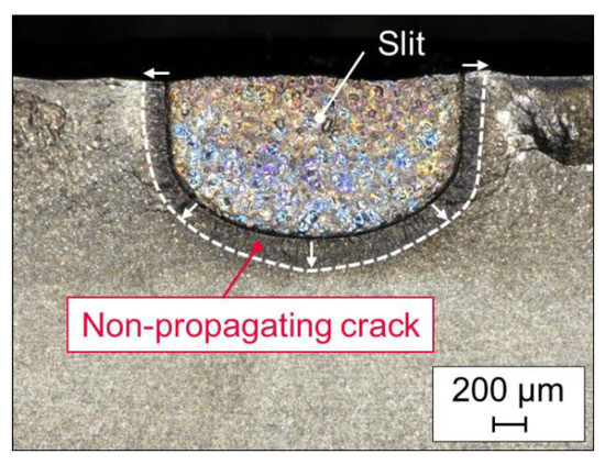 Figure 14 shows the fracture surface around the slit for WNS1.0 that was tested under the fatigue limit. Non-propagating cracks were observed along the slit front, which indicates that the propagation of the fatigue crack initiated from the slit stopped because of large and deep compressive residual stress, as described in Section 3.2.