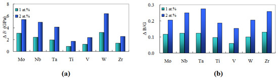 (a) Solute effects on the bulk modulus (B). (b) Solute effects on the B/G ratios.