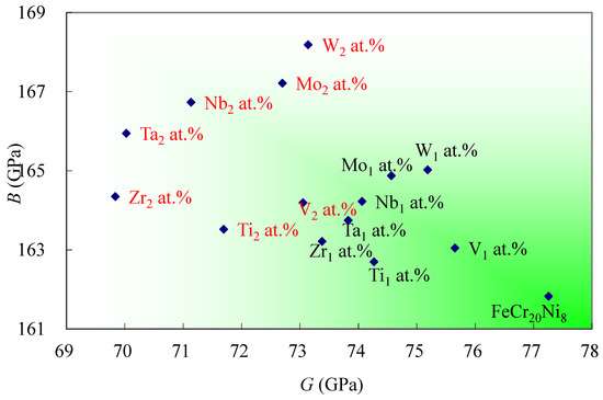 On the one hand, the addition of Mo, Nb, Ta, Ti, V, W and Zr increase the bulk modulus (B). Higher values of bulk modulus (B) correspond to stronger atomic bonds, which results in better resistance to various forms of localized corrosion, such as intergranular corrosion, pitting corrosion and stress-corrosion cracking [10,12,13,14]. On the other hand, these alloy elements might decrease the shear modulus (G). Based on the simulated shear modulus (G) and bulk modulus (B), we proposed a design map of FeCr20Ni8 based alloys. As shown in Figure 3, from left to right, the hardness of annealed alloys could be increased. While, from bottom to top, the resistance to various forms of localized corrosion could be enhanced. Experimentally, Mo, Ti, V and W were used to increase the resistance to intergranular stress-corrosion in various austenitic stainless steels [40,41,42]. This design map could provide a basis for the design of high-performance austenitic stainless steels. All alloying elements considered in this work increase the corrosion resistance and ductility of the FeCr20Ni8 matrix. When using this design map, we should keep in mind the reaction between the selected alloying element and the master alloy must be taken into account. Moreover, the dosage of the alloying element should be dedicatedly controlled to avoid the formation of brittle participates [1].