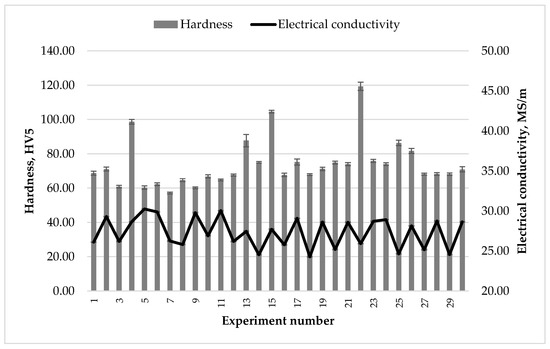 The mean values of results for hardness and electrical conductivity of the flat samples are shown in Figure 1. The heat treatment parameters can be taken from Table 3 according to the numbers of the experiments. The measured hardness of the flat samples varied between 57.16 HV5 and 119.40 HV5. The electrical conductivity fluctuated between 24.26 MS/m and 30.26 MS/m.