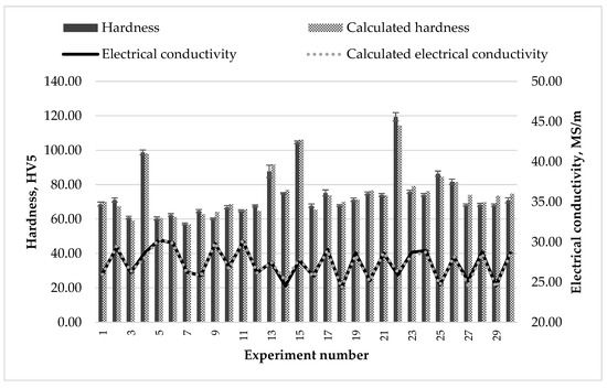 The easily interpretable graphical comparison of the experimental and calculated data for the hardness and electrical conductivity is shown in Figure 3. The calculations were carried out with the heat treatment parameters used to create the regression model. It can be seen that a good agreement between experiment and calculation was reached.