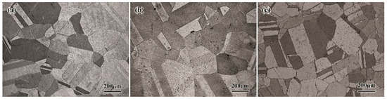 Representative optical micrographs of initial microstructures of Cu–Ni alloy specimens are shown in Figure 1. All specimens exhibit homogeneous microstructures with a similar grain size of about 280 μm, and no second phase was detected in all materials, making it more feasible and simpler to explore solely the impact of SRC on the work-hardening behavior and microstructural evolution in these alloys.