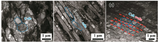 In short, the influence of Ni content on the work-hardening behavior of Cu–Ni alloys is complicated. The work-hardening rate of Stages B and C is markedly improved with increasing Ni content, which results in a higher work-hardening capacity. Therefore, to gain insight into the impact of the Ni content on Stages B and C, the corresponding deformation microstructures were investigated by TEM observations, as representatively shown in Figure 4 and Figure 5.