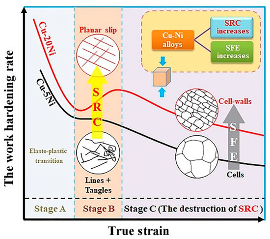 As experimentally revealed and analyzed above, the SRC has a significant effect on the microstructural evolution in Stage B of Cu–Ni alloys, and consequently on the work-hardening behavior in Stage B, as explained in detail below.