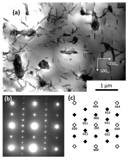 Figure 3a shows a BF image of the Ni3Al-12V alloy specimen isothermally aged at 1123 K for 4 h. The incident beam direction is close to the [001]m zone axis (the subscript “m” denotes the L12 Ni3Al matrix phase). We can see dark contrasts, with a length of approximately 1 μm, extended preferentially along the [100]m and [010]m directions, as indicated by the arrows in Figure 3a. Figure 3b shows a SAED pattern taken from the extended dark contrasts (dotted circle in Figure 3a). The SAED pattern was identified by a superposition of reflections from the L12 Ni3Al matrix shown in Figure 2c, and the Ni3V with a D022 structure from the orthorhombic structure with lattice parameters a = 0.355 nm and c = 0.719 nm, as marked by the diamond shapes in Figure 3c. Thus, the precipitates introduced by aging at 1123 K were identified as D022 Ni3V, which was predicted from the phase diagram of Figure 1. The orientation relationship between the Ni3Al matrix and Ni3V precipitates was [001]m//[001]p, (100)m//(100)p (the subscript “p” denotes the precipitate phase of Ni3V with a D022 structure).