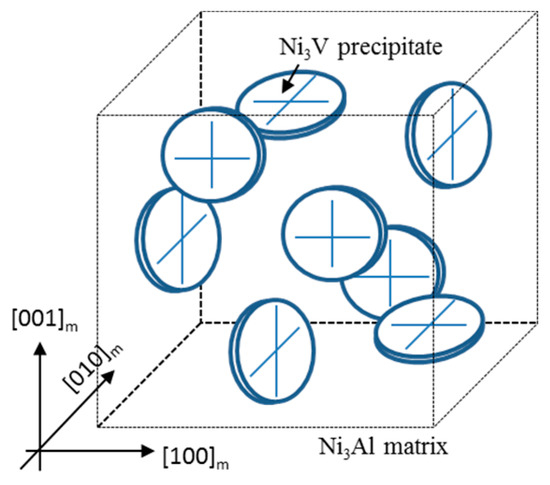 Schematic illustration of D022 Ni3V precipitates in an L12 Ni3Al matrix grain for the aged Ni3Al-12V alloy specimen. Disk-like shaped Ni3V precipitates are dispersed on {001}m planes with a crystallographic orientation relationship, [001]m//[001]p, (100)m//(100)p between the matrix and precipitates.
