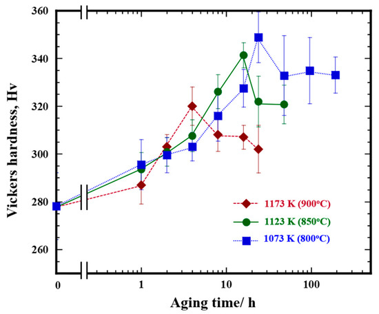 Figure 6 shows the variation in the Vickers hardness of the Ni3Al-12V alloy specimens during isothermal aging at 1073 K, 1123 K, and 1173 K. The hardness for all three aging temperatures increases initially, reaches a maximum value, and then decreases for the specimens that underwent prolonged aging. The value of the maximum hardness decreases with increasing aging temperature, while the period to reach the maximum hardness is shortened.