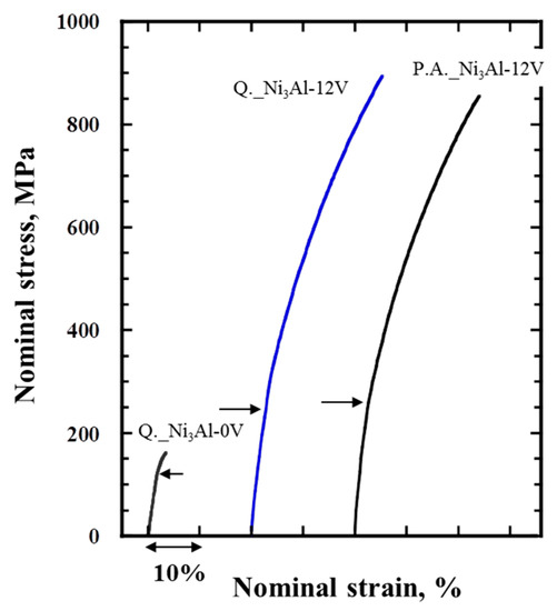 Figure 7 shows the typical nominal stress-strain curves at 298 K for the Ni3Al-12V alloy specimens quenched and peak-aged at 1123 K for 16 h, together with the quenched Ni3Al-0V alloy specimen for comparison. The quenched Ni3Al-0V alloy yields with mild plastic elongation, which is consistent with previous reports [2,7,10]. On the other hand, both, the quenched and aged Ni3Al-12V alloy specimens show a greater yield strength than the quenched Ni3Al-0V alloy specimen, followed by extensive work hardening accompanied by a larger fracture strain. The enhancement in yield strength for both specimens should be attributed primarily to solid-solution hardening by the vanadium atom dissolved in the L12 Ni3Al phase. Mishima et al. reported an increased rate of change in solid-solution hardening per atomic percent, (dσ/dc), for vanadium [27]. However, the detailed influence of a large amount of vanadium dissolving in the Ni3Al phase on the mechanical properties is still unclear. We are systematically investigating this and will report it in the future. The yield strength of the peak-aged Ni3Al-12V alloy specimen seemed to be slightly greater by 15 MPa than that of the quenched Ni3Al-12V alloy specimen. This must be due to the age-induced precipitates of D022 Ni3V in the L12 Ni3Al matrix phase. Nevertheless, yield strengthening by the age-induced precipitates should not be as significant as strengthening by the solid-solution effect of vanadium atoms.