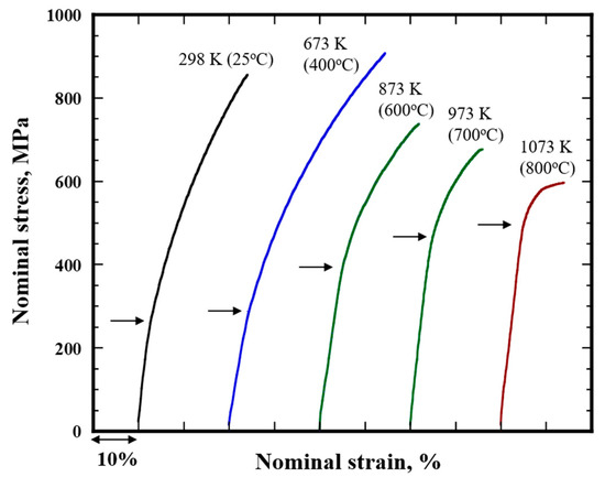 Figure 8 shows the typical nominal stress-strain curves at elevated temperatures from 298 K to 1073 K for the Ni3Al-12V alloy specimens peak-aged at 1123 K for 16 h. The 0.2% yield strength is shown by arrows in Figure 8. Figure 9 summarizes the yield strength (0.2% proof stress), ultimate tensile strength, and fractural strain for the Ni3Al-12V alloy specimens quenched and peak-aged at 1123 K for 16 h as a function of the testing temperature. In comparison to the stoichiometric Ni-25 at.% Al binary alloy [10], the yield strengths of the quenched and peak-aged Ni3Al-12V alloy specimens at 298 K are higher, as described above. Notably, the yield strength of both specimens steadily increases with the testing temperature to 1073 K, indicating an anomalous temperature dependency of yield strength, similar to other L12 intermetallic compounds [1,2,42], while that of the stoichiometric Ni3Al binary alloy specimen shows a peak at around 800 K. The peak temperature at which the maximum flow strength is observed has been suggested to be associated with the transition of the slip system with temperature [3,43]. Accordingly, the result observed in Figure 9a indicates that the transition temperature of the slip system from <110>{111} to <110>{100} is raised due to the effect of the vanadium atom dissolving in the Ni3Al matrix phase.