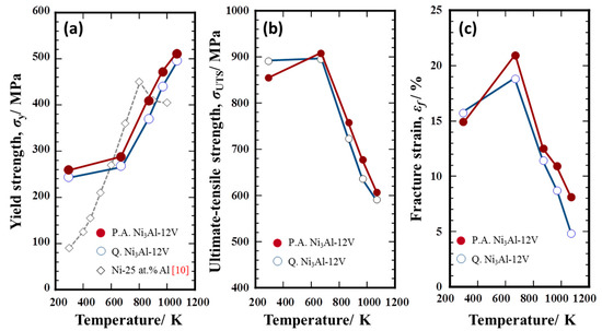 Variations in (a) yield strength (0.2% proof stress), (b) ultimate tensile strength, and (c) fracture strain for the Ni3Al-12V alloy specimens quenched (Q.) and peak-aged (P.A.) at 1123 K for 16 h as a function of the testing temperature.