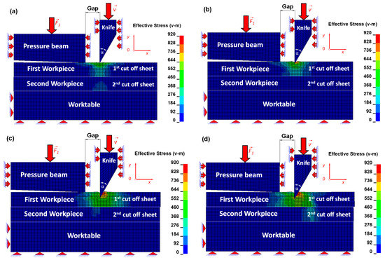 The final stage of cutting is very interesting because it is connected with brittle cracking produced by tensile stresses. The described phenomenon is very similar to the experimental uniaxial tensile test. At the end of the stretching test, a neck is formed and cracking appears. This experimental tensile test is similar to the cracking observed during cutting of the sheet in the case where the tip of the blade penetrates into the sheet being cut at a height bigger that 1/3 of the height of the sheet. The cut surface is smooth, without burrs and vertical scratches. Such cut surfaces are required because they are fine unlike those induced by shearing accompanied by many defects. So, the only problem is the first stage concerning the shearing. It takes place from zero to circa 1/3 of the height of the sheet measured from its top downwards. During the shearing edge bending, scratches and large plastic zones are formed. On such cut surfaces there are many defects which are not desired (Figure 4a–c, Figure 5g–i, Figure 6a–c and Figure 7g–i). The more sheets in a bundle, the more numerous are the defects. The sheet with the most defects is always the last one at the bottom. This work deals with only two sheets in a bundle but it is enough to prove numerically as well as experimentally that plastic deformations are more severe during the cutting of the last bottom sheet in a bundle (Figure 4c,d, Figure 5i,j, Figure 6c,d and Figure 7i,j). The elastic and plastic zones during cutting of the second sheet are similar to the first one.