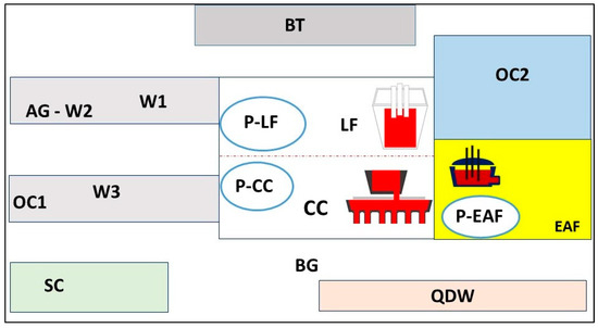 - at a distance of 50 m from the electric arc furnace (EAF), 2 m from the ladle furnace (LF), 2 m from the continuous casting (CC), and within the control consoles (respectively P-EAF, P-LF and P-CC);