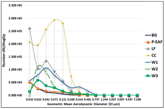 Figure 2 shows the distribution of particle number concentration measured by ELPI+ in the BG, P-EAF, LF, CC, W1, W2 and W3 samples.