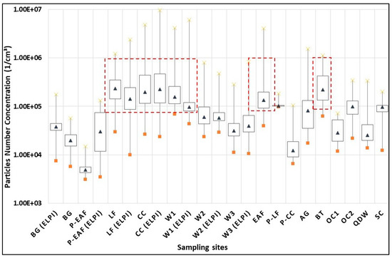 The UFP median of background levels was found to range from 1.97 × 104 to 3.83 × 104 part/cm3. The median of UFP ranged from 4.91 × 103 to 2.33 × 105 part/cm3, respectively, inside the EAF control pulpit and next to the ladle furnace sampling site. The maximum concentration was measured in close proximity to the continuous casting line (9.48 × 106 part/cm3), while in the welding positions the median of UFP ranged between 3.15 × 104 and 1.57 × 105. Finally, the UFP median measured during the lunch break was 9.64 × 104 part/cm³.