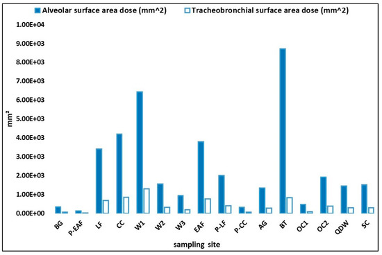 The maximum UFP surface area concentration (µm2/cm3) in the alveolar tract was found in BT, and the maximum UFP surface area concentration (µm2/cm3) in the tracheobronchial tract was found in W1 (mean) and BT (median). The minimum value of UFP surface area concentration was found in P-EAF. Figure 4 shows the estimated doses of UFP surface areas in the alveolar and tracheobronchial tracts for each measuring point. The highest average values of surface area, in terms of dose deposited in the alveolar tract, were measured at BT, W1, CC, EAF and LF, whereas, the highest average surface area values, in terms of dose deposited in the tracheobronchial tract, were measured at W1, CC, BT, EAF and LF.