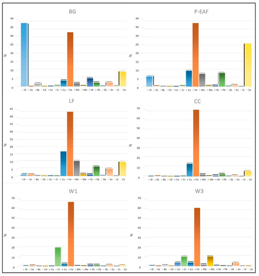 Figure 5 shows the concentration of the metal elements analysed in the ultrafine particulate collected by ELPI+. Variable concentrations of the metallic elements were observed in relation to the different sampling sites and to the different granulometric fractions analysed. In particular, Al 38%, Fe 33%, Zn 9%, Ni 5% and Cu 4% were the metallic elements most represented in BG. Fe 38%, Zn 26%, Cu 10%, Mn 8% and Pb 8% were the metallic elements most represented in P-EAF. Fe 44%, Cu 17%, Mn 11% and Zn 10% are the most represented metallic elements in LF. Fe 70%, Cu 14%, Zn 6%, Mn 3%, Pb 3% were the most represented metallic elements in CC. Fe 67%, Cr 20% and Fe 61%, Mo 11%, Cr 10% were the major metallic elements represented in W1 and W3, respectively. Figure 5 shows the concentrations of the metallic elements (in percentage) analysed in the ultrafine particulate collected in BG, P-EAF, LF, CC and in two welding stations (W1 and W3).