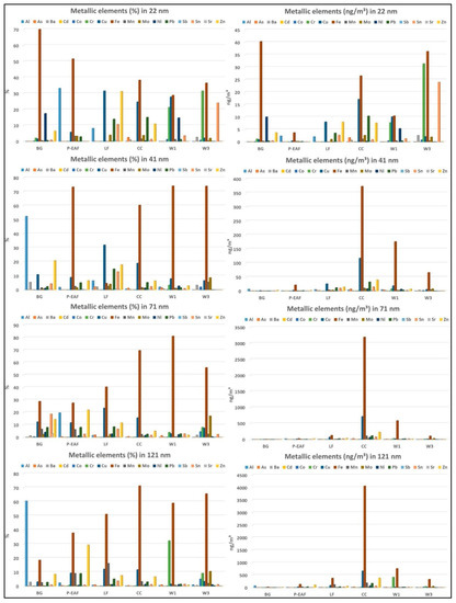 Overall, the metallic elements determined in LF, CC and P-EAF showed a trend comparable with a greater concentration of metallic elements in the fractions of 71 nm and 121 nm. The metallic elements determined in the particles collected outside the plant did not show a clear trend. Some of these elements are more present in particulates of 22 nm, others in the fraction of 71 nm or 121 nm. The metallic elements determined in the UFPs collected in W1 show a trend similar to that observed in the other sampling sites inside the plant, however an important concentration is present in the size range of 41 nm. In W3, the metallic elements show a less clear trend compared to the elements determined in W1, however, most of the metallic elements are present in the size range between 71 and 121 nm. Figure 6 shows the chemical composition in percent (left) and in ng/m³ (right) of the metallic elements in the different particle size ranges, for each area and working station.