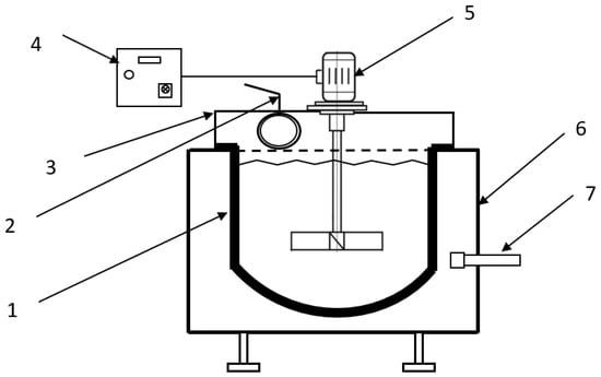 The research included two series of experiments: the first involved the processing of PbSnIn alloy, and the second was focused on PbSnCuGeIn alloy. Each series included five tests performed with the application of the thermal oxidation method in a 1-tonne refining kettle fired with natural gas and air, equipped with a mixer with a rotation speed of 50–450 rot/min and a thermocouple NiCr–Ni in a ceramic cover, used to measure the metal temperature. The installation diagram is presented in Figure 2.