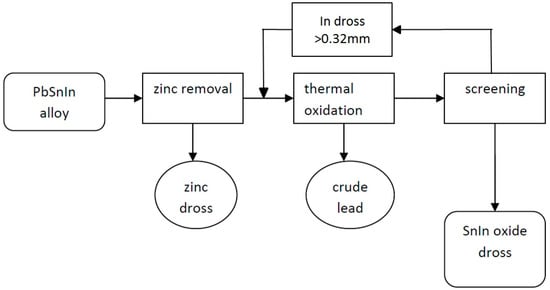 The described pyrometallurgical process of indium removal from the PbSnIn alloy resulted in the production of an indium-enriched semi-product (1.15% In), with a direct indium-recovery rate of about 83%, in the form of an indium-oxide dross suitable to be further processed in the hydrometallurgical stage. Other byproducts from this stage, PbSn alloy (crude lead) and zinc dross, could be easily processed in the proper sites of the zinc smelter technological flowsheet. Thermal oxidation for each test was carried out at 650 ± 20 °C within 7–12 h, in the presence of free atmospheric air, with intense stirring (400 rot/min).