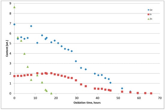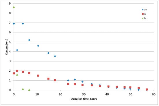 Figure 6 and Figure 7 present the chemical composition change of the alloy during thermal oxidation for Tests 4 and 5. Metals from Tests 1–3 were returned to the thermal oxidation step because the content of Ge and In was too high. The chemical composition of the metal obtained from the thermal oxidation of PbSnCuGeIn is presented in Table 5. The chemical composition of the oxide-GeIn dross <0.32 mm is presented in Table 6, and the chemical composition of the sodium–GeIn dross in Table 7.