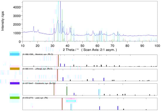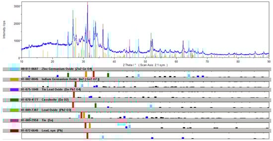 The phase analysis of the In <0.32-mm drosses indicates the presence of PbO and SnO2 oxides as well as small amounts of metallic Pb. No In2O3 was observed, possibly because the concentration was too low. The diffraction pattern of the qualitative XRD phase analysis of the In <0.32-mm dross is presented in Figure 8.