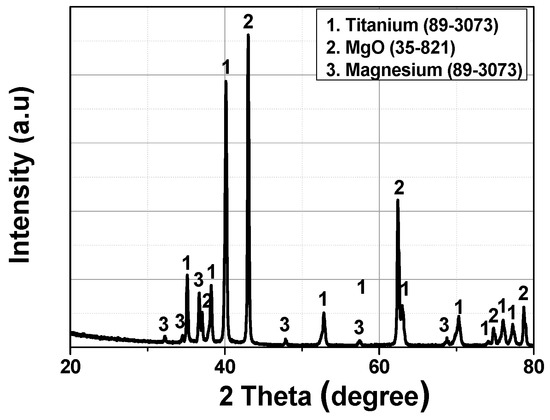 In our previous work, we produced Ti powder directly from Ti dioxide by self-propagating high-temperature synthesis (SHS) using Mg as a reducing agent. After leaching, a spherical Ti powder was prepared by plasma treatment. X-ray Diffraction (XRD) images of the sample produced by the SHS process are shown in Figure 1. MgO and residual Mg were detected as reaction by-products in addition to Ti [13]. No intermediate phases such as Ti10O9, Ti3O5, or Ti2O3 were identified. If these intermediate phases were to be produced, it would be almost impossible to achieve reduction using Mg as a reducing agent [14].