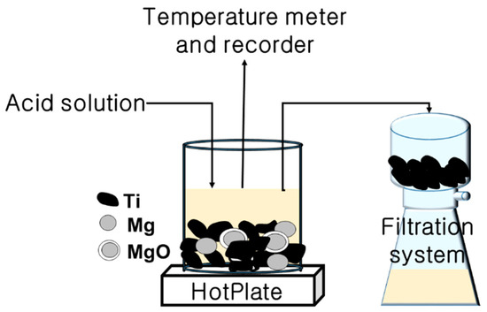 Raw materials used in this study included: Ti powder was prepared by SHS using Titanium dioxide powder (TiO2, 99.99 mass%, particle size 2 μm, Kojundo Chemical Laboratory Co., Ltd., Saitama, Japan) and Mg powder (Mg, >98.5 mass%, particle size <74 μm, DaeJung Chemicals and Metals Co., Ltd., Siheung, Korea) as raw materials. Acid solutions used in leaching to remove the Mg and MgO by-products were hydrochloric acid (HCl, 35–37 mass%, Junsei Chemical Co., Ltd., Tokyo, Japan) and acetic acid (CH3COOH, 99.5 mass% min, OCI Co., Ltd., Seoul, Korea).