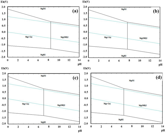 Pourbaix diagrams for Mg-H2O system over a pH range of 0–14 and an electropotential range from −2.0 V to 2.0 V vs. SHE at (a) 25 °C, (b) 50 °C, (c) 75 °C, and (d) 100 °C.