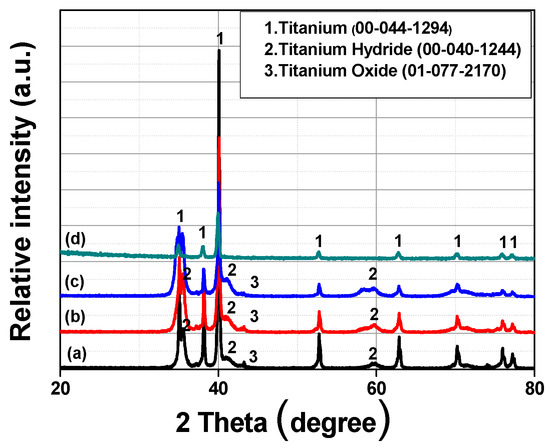 The above phenomenon occurred because the pH of the leaching solution used to remove MgO and Mg was lower than that used for experiments 1–1 and 1–2. The pH can be expected to be lower than that at which Mg(OH)2 precipitates, even when the pH increases during the leaching process. XRD analysis also confirmed the presence of TiH2, which was expected to be produced by the contact between hydrogen ions in the solution and Ti. The reaction formula is given by Equation (6). The TiH2 dehydrogenation behavior of the product was studied by several researchers who found that it is relatively easily removed by vacuum heat treatment at 700 °C [18].