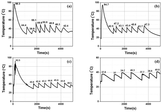 Temperature of leaching solution during two-step acid leaching process: (a) experiment 2–1 (8.5 M CH3COOH, 6.5 M HCl), (b) experiment 2–2 (0.6 M HCl, 6.5 M HCl), (c) experiment 2–3 (0.6 M HCl, 7.5 M HCl), and (d) experiment 2–4 (0.4 M HCl, 7.5 M HCl).
