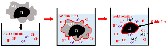In all the three experiments, we detected Ti oxide, which was not detected after the combustion synthesis. As shown in Figure 6a–c, when acetic acid and HCl were used, the temperature increased sharply during the acid-leaching process. This was caused by an exothermic reaction that occurred when MgO and Mg surrounding the Ti exothermically reacted with each other. MgO melted and the heat was transferred to the Ti surface, which reacted with the oxygen ions present in the solution to form an oxide film on the Ti powder surface. This is presumed to be the reason for the detection of Ti oxide. Figure 7 is a schematic illustration of Ti oxide formation.