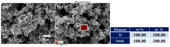 To identify the morphology of the reaction product and its purity, a sample produced in experiment 2–4 was subjected to FE-SEM and EDS analyses. The results of the analysis are shown in Figure 8. The prepared Ti powder exhibited an irregular shape, and the EDS results revealed that the Ti powder contained no impurities at all.