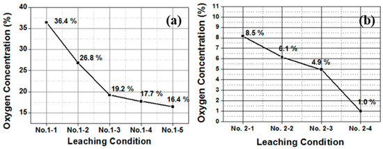 The oxygen contents of the Ti powders prepared according to Groups 1 and 2 leaching experimental conditions were measured using an NO/H analyzer. The results are shown in Figure 9. The concentration of MgO under each condition was about 10–19%, as mentioned above, for the first experiment. The second group of experiments also led to the formation of Ti oxides through an exothermic reaction between the reaction by-products and the acid solution in experiments 2–1 to 2–3, resulting in a remarkably high oxygen value. However, Ti oxide was not formed once the exothermic reaction was controlled by increasing the amount of distilled water used in experiment 2–4, and all the by-products were removed, leaving only the Ti single phase with an oxygen content of about 1.0 wt%.