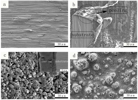 Figure 2d shows the surface morphology of PEO–PTFE composite coating. Compared with Figure 2c, it can be observed that a great deal of micro-pores on the PEO TiO2 coating had been filled with PTFE and the porosity of the PEO TiO2 coating decreased significantly. During the process of sintering treatment, the sample was heated to 350 °C, which exceeded the melting point of PTFE materials [17]. As the PTFE has a dynamic viscosity in the melting state, the melted PTFE filled the pores of PEO and formed a continuous composite PEO–PTFE coating [18,19,20]. Obviously, the rough and porous PEO surface enhanced the crosslinking and bonding performance of PTFE materials to the bottom of the TiO2 coating.