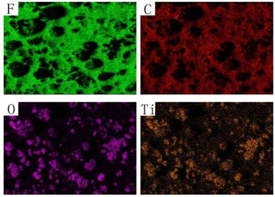 The EDS elemental maps of the PEO–PTFE composite coating is shown in Figure 3, which are obtained from the EDS scanning of Figure 2d. F and C elements were detected in the PEO–PTFE composite coating, indicating that PTFE materials deposited successfully on the PEO coating. From the distribution of F and C elements, it can be found that the most area of the PEO coating was covered by PTFE materials, except for the locations where the PEO oxides highly accumulated. This phenomenon is because of the fluidity of PTFE materials during the dipping and sintering processing. The mechanical interlinking formed between the porous PEO coating and the continuous PTFE materials after the sintering treatment. Such mechanical interlinking ensured a good bonding performance of the PEO–PTFE composite coating. In contrast to the single PEO TiO2 coating, this PEO–PTFE composite coating maintained the good wear-resistance of the ceramic PEO component while its PTFE component played the role as the friction-reducing lubricant. As reported in a recent study, a self-lubricating PEO coating was fabricated on AZ91 magnesium alloy via the in-situ incorporation of PTFE particles [21]. Results showed that the in-situ PTFE incorporation into the growing PEO coating resulted in non-uniform PTFE distribution and some PTFE-enriched ridge-like protrusions were formed on the coating surface. When the incorporation time was sufficient, the PTFE-enriched protrusions formed can act as lubricant reservoirs, leading to a low and stable friction coefficient. The present PEO–PTFE composite coating aimed to achieve uniform PTFE distribution by using the dipping and sintering treatments, ensuring even and sufficient PTFE lubricant supply during the friction and wear test.