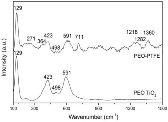 The Raman spectra of PEO TiO2 coating and PEO–PTFE composite coating are shown in Figure 4. Recorded Raman spectra were made in the frequency range from 100 to 1500 cm−1. It can be seen from the Raman spectrum of PEO TiO2 coating that bands shift located at 129 (Eg) and 498 (A1g) cm−1 positions originate from different modes of anatase TiO2 [22]. Bands shift located at 423 (Eg) and 591 (A1g) cm−1 positions originate from different modes of rutile TiO2. It can be inferred from Raman spectra of the PEO coating that there are two TiO2 crystal structures with anatase and rutile on the surface of the coating. According to the Raman spectrum of PEO–PTFE composite coating, one can see that some characteristic peaks of PTFE can be detected. The Raman peaks at 271, 364, 711 and 1360 cm−1 are related to the different vibrational modes of CF2 groups, whereas bands shift located at 1218 and 1282 cm−1 positions come from the bands C-C and CF, respectively [23]. The Raman result is consistent with the previous EDS analysis result, indicating the successful deposition of PTFE on the PEO coating.