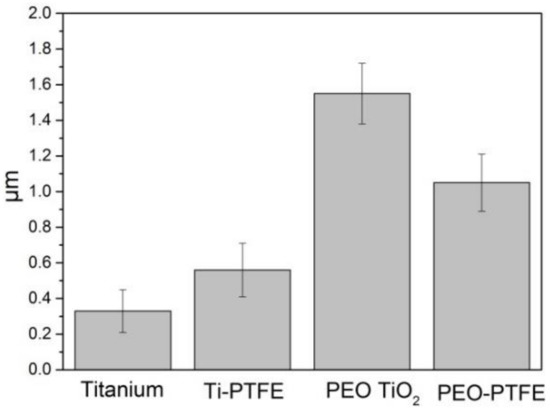 Figure 5 presents the surface roughness (Ra) of the titanium substrate, Ti-PTFE coating, PEO TiO2 coating, and PEO–PTFE composite coating. Compared with the titanium substrate, the roughness of Ti-PTFE coating slightly increased. This is because the Ti-PTFE coating deposited directly on the smooth titanium substrate was easy to peel off (see Figure 2b), causing a rougher surface than the titanium substrate. The roughness of the PEO TiO2 coating turned out to be the highest due to the existence of micro-pores and micro-protrusions on its surface (see Figure 2c). PTFE polymer materials deposited into the porous TiO2 coating (see Figure 2d) and formed the composite coating. Therefore, the roughness of the PEO–PTFE composite coating decreased significantly compared with the PEO TiO2 coating.