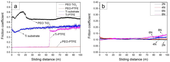 Friction coefficient of different samples against GCr15 after a sliding distance of 100 m (a) titanium substrate, Ti-PTFE coating, PEO TiO2 coating and PEO–PTFE composite coating under the load of 4 N; (b) PEO–PTFE composite coating under different loads.