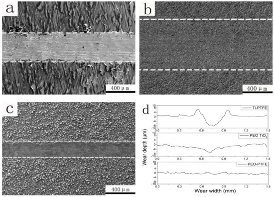 Scanning electron microscope (SEM) images and cross-sectional profiles of wear tracks after a sliding distance of 100 m under the 4 N load of the (a) Ti-PTFE coating; (b) PEO TiO2 coating; (c) PEO–PTFE composite coating; and (d) cross-sectional profiles of wear tracks.