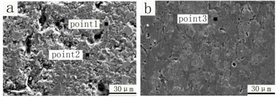 Figure 8 shows the micro worn morphologies of the PEO TiO2 coating and the self-lubricating PEO–PTFE composite coating after a sliding distance of 100 m under the 4 N loading. The element composition of wear tracks were examined by EDS and the results are listed in Table 2. For the worn track of PEO TiO2 coating (Figure 8a), it can be seen that there were still a great deal micro-pores after the tribo-test, indicating high porosity both in its surface and interior. The existence of micro-pores and debris greatly weakened the strength and toughness of the PEO TiO2 coating. It can be observed that there were two kinds of typical worn surface morphologies of the PEO TiO2 coating, as marked by point 1 and point 2 in Figure 8a. The first worn morphology (see point 1 in Figure 8a) was relatively smooth. A lot of Fe and O elements as well as a small quality of Cr element were detected (see Table 2), indicating that materials were transferred from the GCr15 ball to the PEO coating surface during the wear process. The second worn morphology (see point 2 in Figure 8a) was relatively rough. The brittle and porous surface layer of the PEO coating was crushed under the normal loading and formed lots of oxide debris at the initial stage of the tribo-test, which caused abrasive wear between the PEO coating and GCr15 ball during the subsequent tribo-test. Therefore, lots of O, Ti and Si elements and small amounts of Fe elements derived from GCr15 ball were detected (see Table 2).