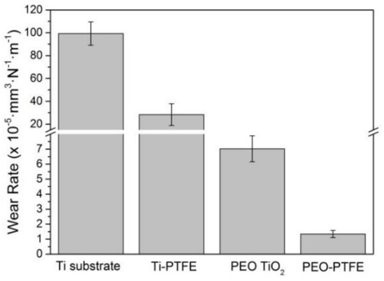 Wear rate of the titanium substrate, Ti-PTFE, PEO TiO2 coating and the self-lubricating PEO–PTFE composite coating under the load of 4 N and the sliding distance of 100 m.