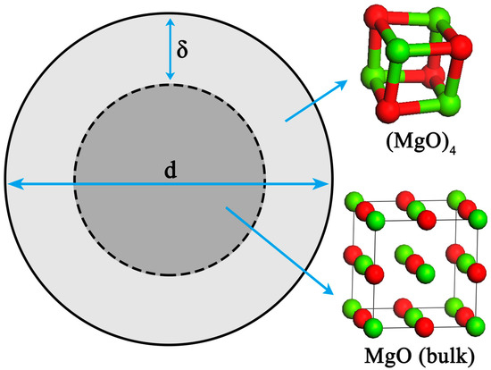 The nano-particle consists of two parts [27,28,29,30]: An internal part (atoms located in the lattice of crystallites) and an external part (atoms situated in the particle surface). In this work, the nano-magnesia, which is described as a sphere particle with diameter d, contains a shell with thickness δ and a core with diameter (d − 2δ), as schematically shown in Figure 1.