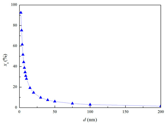 where Ni and Ns are the atom numbers at the inner and surface, respectively. ρi is the atomic densities of internal part. ρs is the atomic densities of surface part. Experiments indicated that the atomic density at particle surface is lower than that of the perfect crystal by 10–30% [28,29]. Thus, the value of ρi/ρs was taken as 1.2 in the calculation of thermodynamic properties of nano-magnesia. The atomic fraction in the shell of nano-magnesia xs are shown in Figure 2.