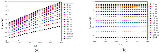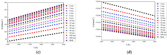 The thermodynamic properties of nano-MgO in the temperature range from 1500 K to 2000 K are shown in Figure 3. The parameters of nano-MgO (H, S and CP) increase with the increasing particle size. In addition, H and S increase with the increasing temperature, while CP is almost a constant in the same particle size at the range from 1500 K to 2000 K. The Gibbs free energy for nano-MgO was calculated by G = E(0 K) + GV, where E (0 K) is the total energy at 0 K and GV is the vibrational free energy. The vibrational free energy was calculated as GV = H − TS. The Gibbs free energy of nano-MgO decrease with the increasing temperature. This result indicates that the stability of MgO increases with the increasing temperature, and the crystals (bulk) is more stable than nano-crystal. The Gibbs free energy of nano-MgO decrease with the increasing particle size. Therefore, the nano-MgO tends to grow up into MgO (bulk).