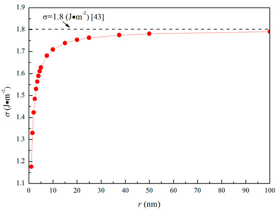 where σ0 is the surface free energy of a liquid droplet with radius of r, σ is the surface free energy of zero curvature, VA is the molar volume of magnesia, and Г is the surface excess. Here, Г is assumed to be Г = N−1/3VA−2/3 [24], where N is Avogadro’s number. Equation (14) is applicable only to liquid droplets surrounded by the gas phase. However, the relationship between gas and liquid droplets is similar to that between liquid iron and magnesia inclusion because [Mg] and [O] in liquid iron are very low and the bond energy of magnesia is considerably larger than that of liquid iron. Therefore, Equation (14) was used in the estimation of the interfacial free energy between magnesia particle and liquid iron. Figure 4 shows the dependence of σ0 on r. In this way, the interfacial free energy changes ∆GI can be written as