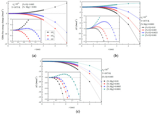 Figure 5b,c show the Gibbs free energy changes for the formation of magnesia with various initial oxygen and magnesium contents in Fe-O-Mg melt. Figure 5b is the case of initial [%Mg] = 0.0001, and Figure 5c is the case of initial [%O] = 0.005. Figure 5b shows that ∆G at [%O] = 0.01, [%O] = 0.005 and [%O] = 0.0025 are negative with respect to r, except in the small-radius region, whereas ∆G at [%O] = 0.001 is positive. This result indicates that nucleation of magnesia does not occur at [%O] = 0.001. The critical nucleation radius for [%O] = 0.01, [O%] = 0.005 and [%O] = 0.0025 are 0.8 nm, 1 nm and 1.6 nm. This result means that the critical nucleation radius increase as initial oxygen decrease. In other words, the energy barrier for the formation of magnesia increases as initial oxygen decrease. Figure 5c shows that ∆G at [%Mg] = 0.01 and [%Mg] = 0.001 are negative with respect to r, whereas ∆G at [%Mg] = 0.0005 and [%Mg] = 0.0001 is positive in the small-radius region. This result indicates that nucleation of magnesia can occur easily at [%Mg] = 0.01 and [%Mg] = 0.001. In addition, the critical nucleation radius for [%Mg] = 0.01, [%Mg] = 0.001 and [%Mg] = 0.0005 are 0.3 nm, 0.4 nm, and 1 nm, which indicate that the critical nucleation radius also increases as initial magnesium decreases. Therefore, the supersaturation ratio of [Mg] and [O] in Fe-O-Mg melt is essential for the formation of solid magnesia in Mg-deoxidation process.